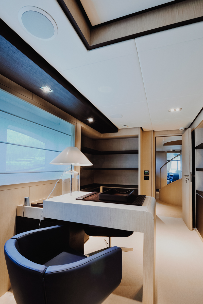 Si è scelto così di alleggerire il decor degli interni con il Rovere e il Wengè, pur mantenendo il parquet in mogano, e inserendo moquette in lana, seta e travertino in velluto. Lo stesso stile è stato applicato anche a tutti i bagni, ampliando le finestrature per una maggiore esposizione alla luce. Sono poi state create due cabine armatoriali: una già presente nel MD e una nel LD, ottenuta unendo due guests cabin.