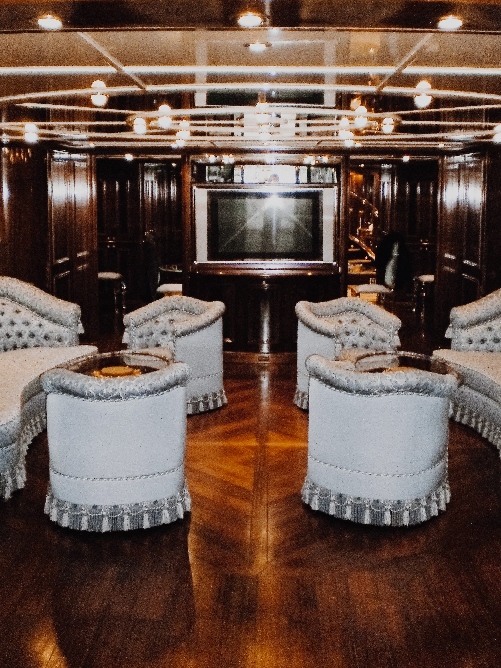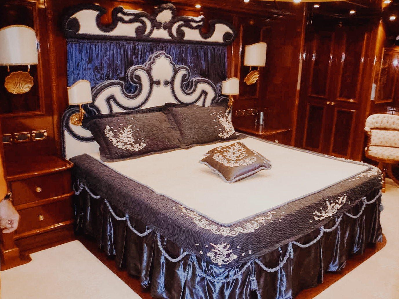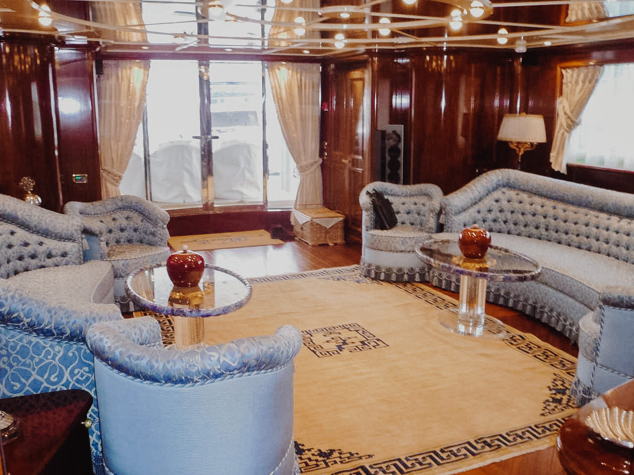 L’acquisto del MY Blue East (Baglietto di 45 mt) è stato effettuato con l’idea di modernizzarlo. La scelta di elementi quali mogano, inserti in piuma di mogano 100% gloss, tessuti broccati e lampassi con dettagli marini e metalli in oro lucido, appesantivano l’atmosfera della barca, rendendola molto buia.